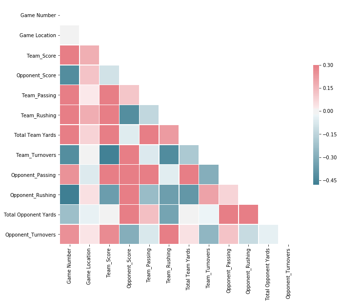 To build the Linear Regression Model, I used the variables of Opponent, Game Location, Team_Score, Opponent_Score, Team_Passing, Team_Rushing, Total Team Yards, Team_Turnovers, Opponent_Passing, Opponent_Rushing, Total Opponent Yards and Opponent_Turnovers.
